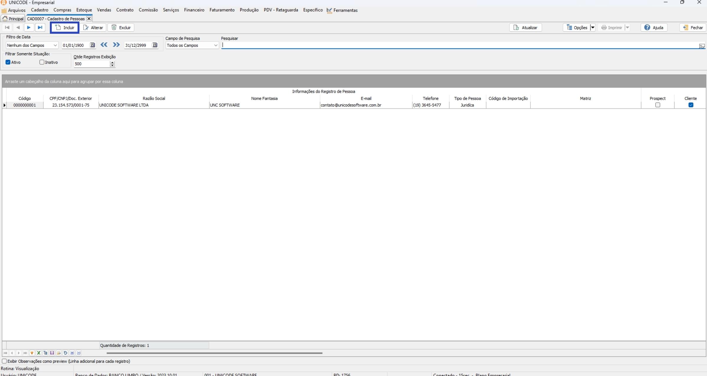 2. Clique no botão “Incluir” no canto superior esquerdo da tela;