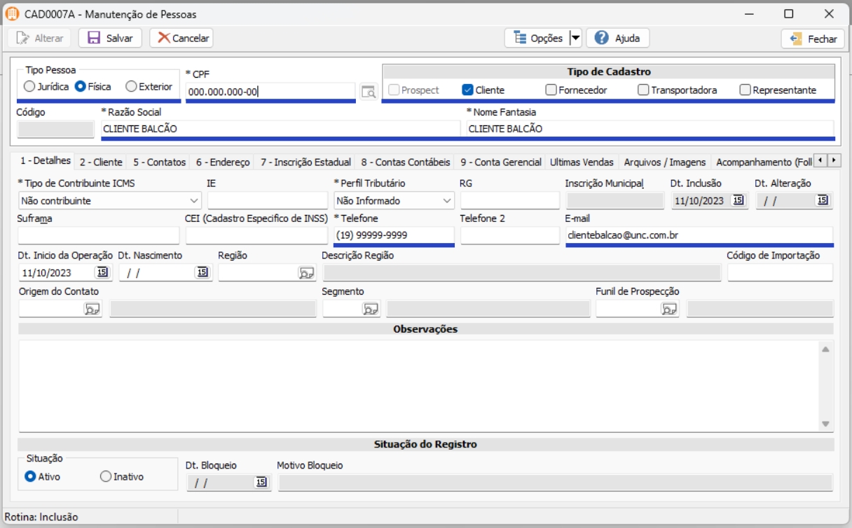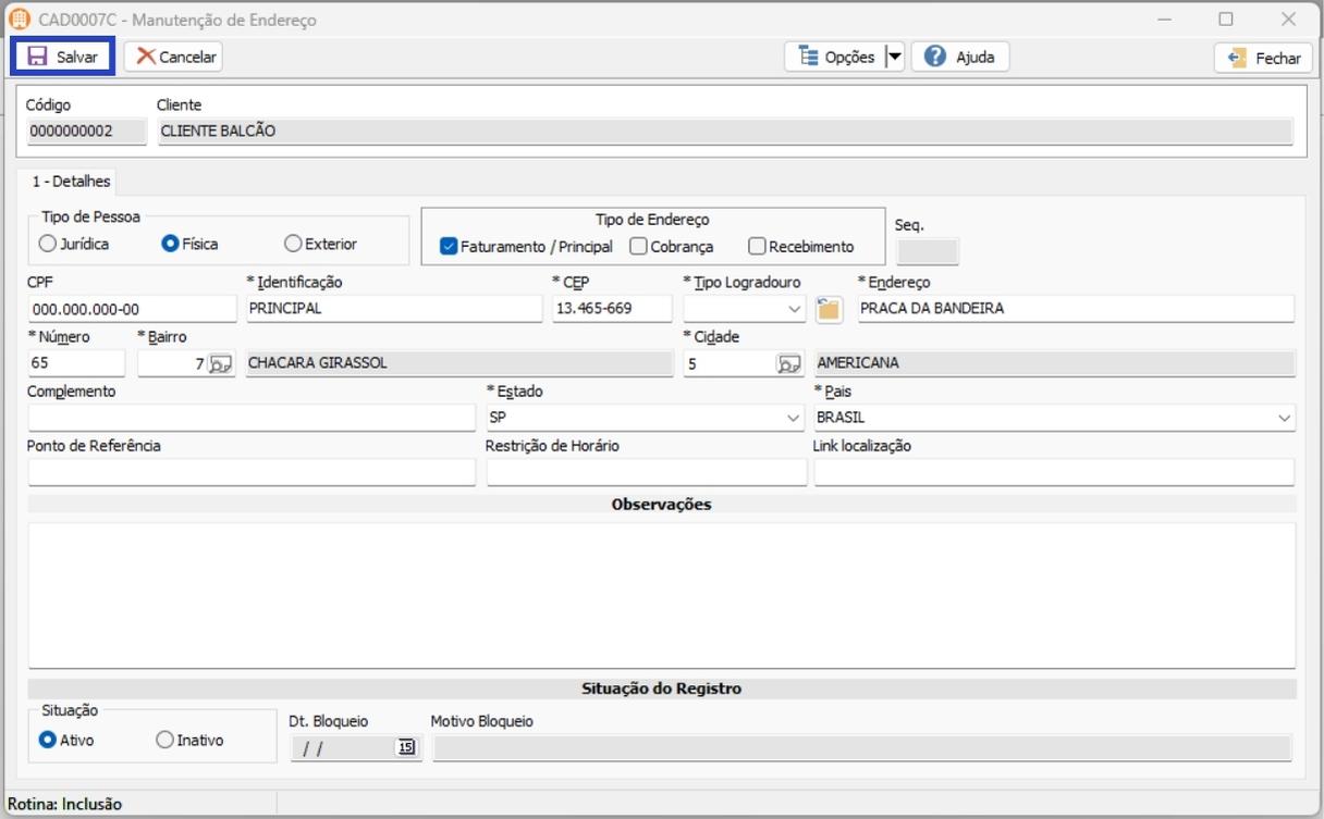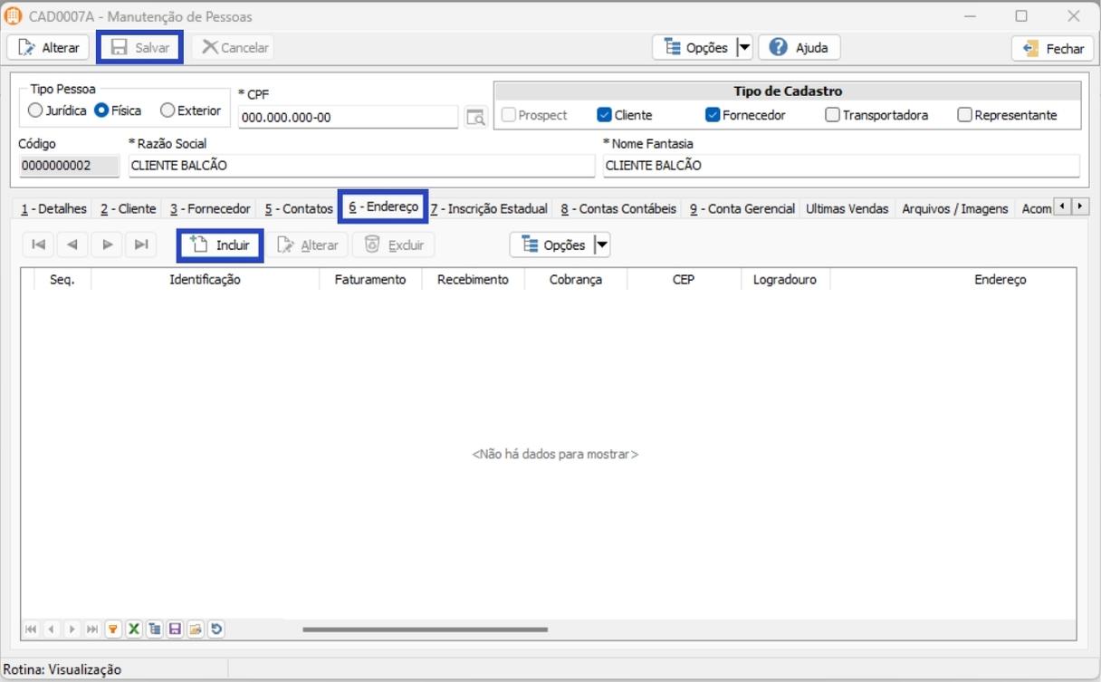 4. Com o seu registro salvo, na aba 6 – Endereço inclua o endereço desse registro;