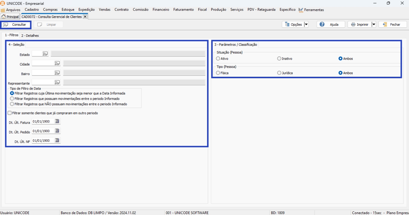 Ao lado direito conseguimos fazer mais filtros direcionados a situação e tipo do cliente: