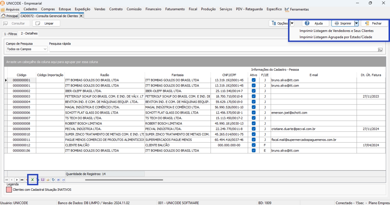 3. Na consulta, é possível realizar a exportação dos registros para Excel e/ou a impressão.