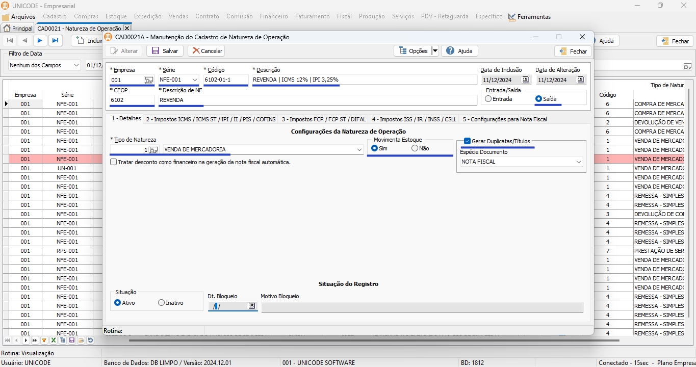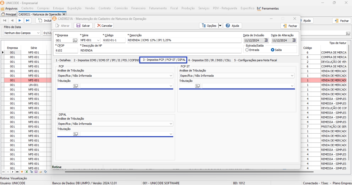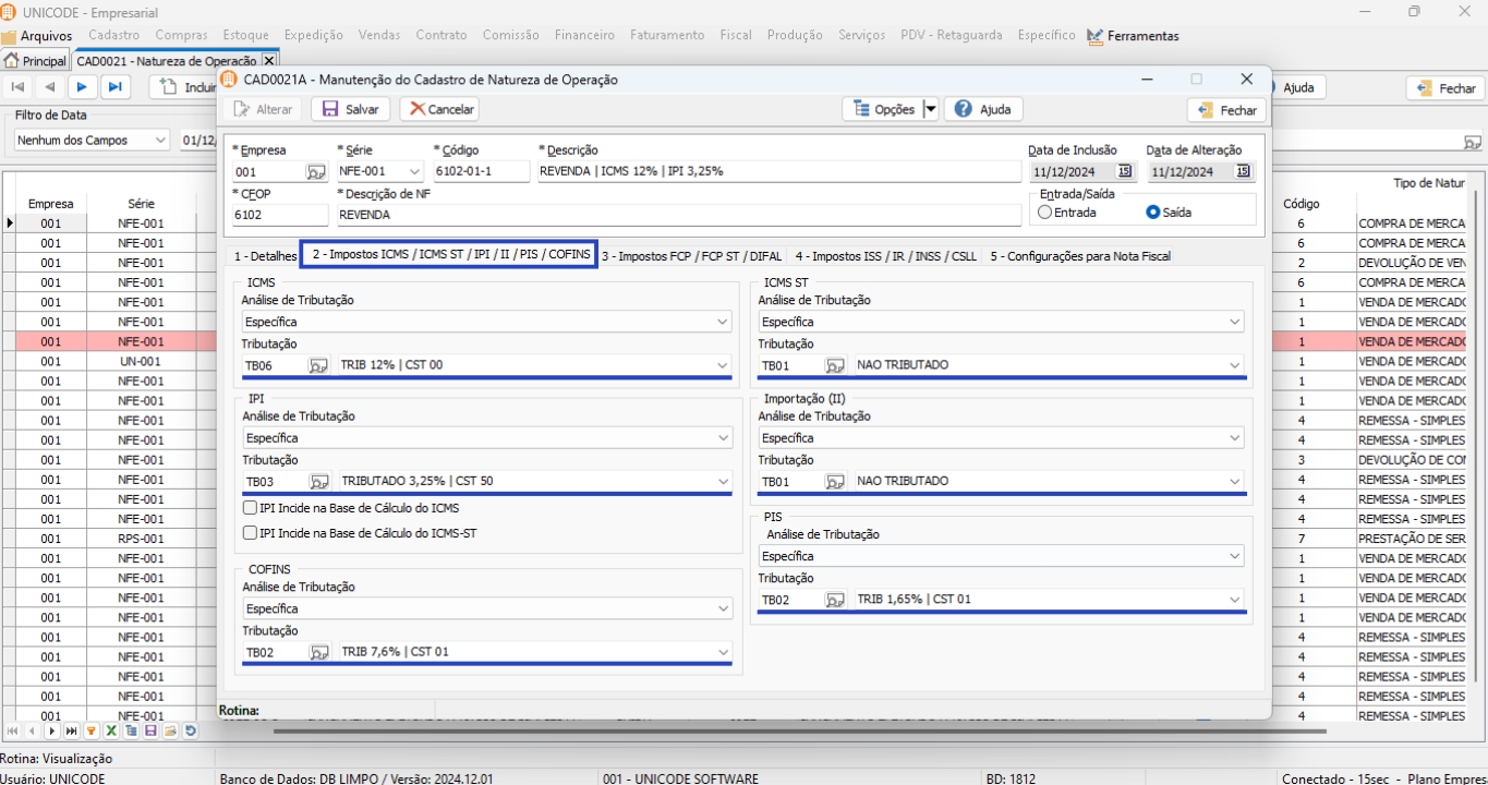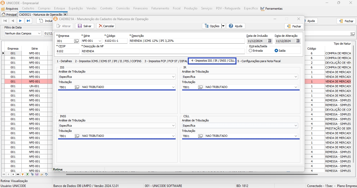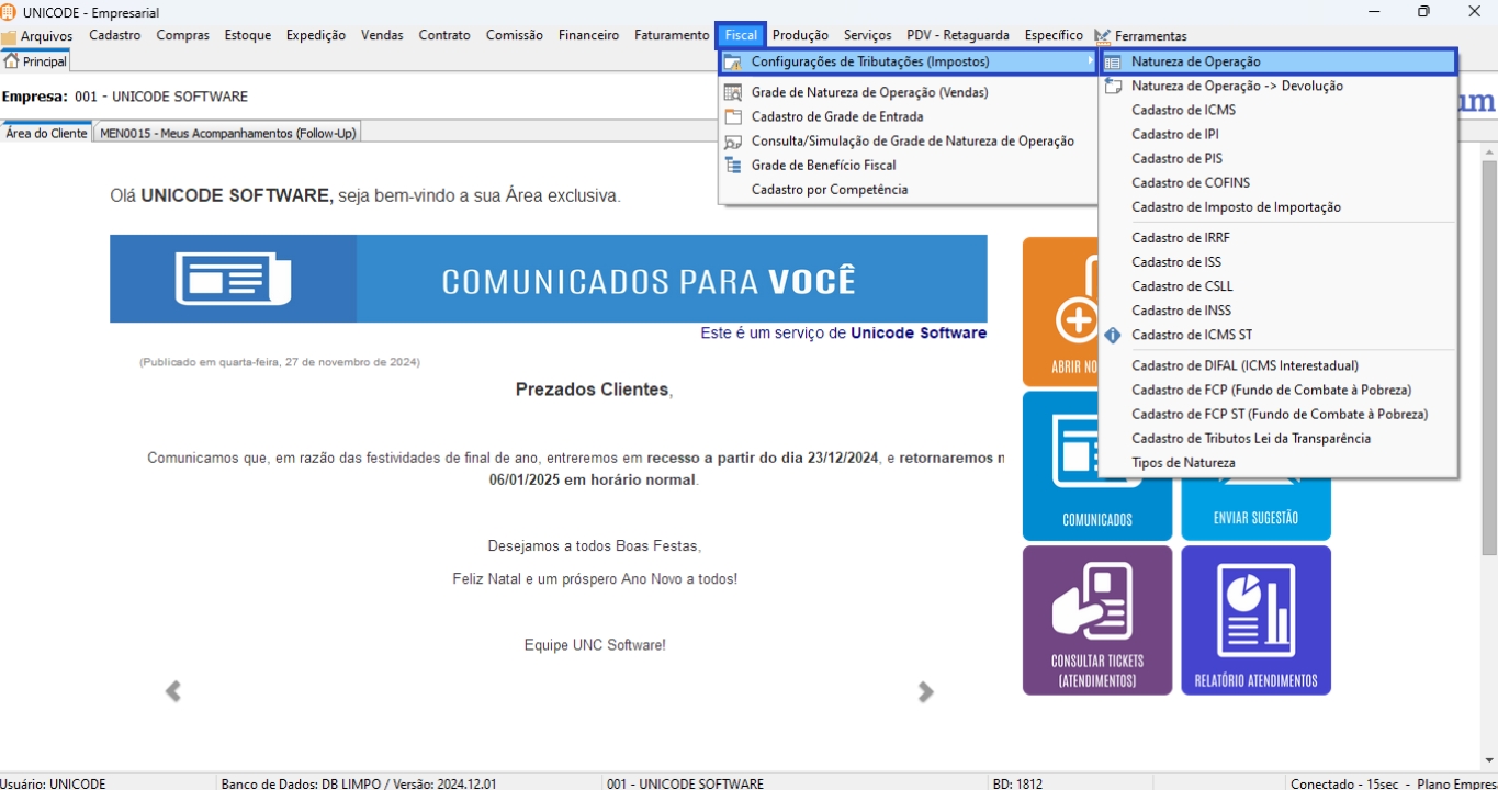 1. Clique em “Fiscal”, selecione a opção de “Configuração de Tributação (Imposto)” e “Naturezas de Operação”;