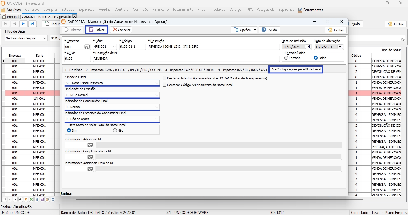 7. Nas abas 5 – Configurações para Nota Fiscal preencha as informações, referente a: Modelo Fiscal, Finalidade da Emissão, Indicador de Consumidor Final, Indicador de Presença do Consumidor Final.