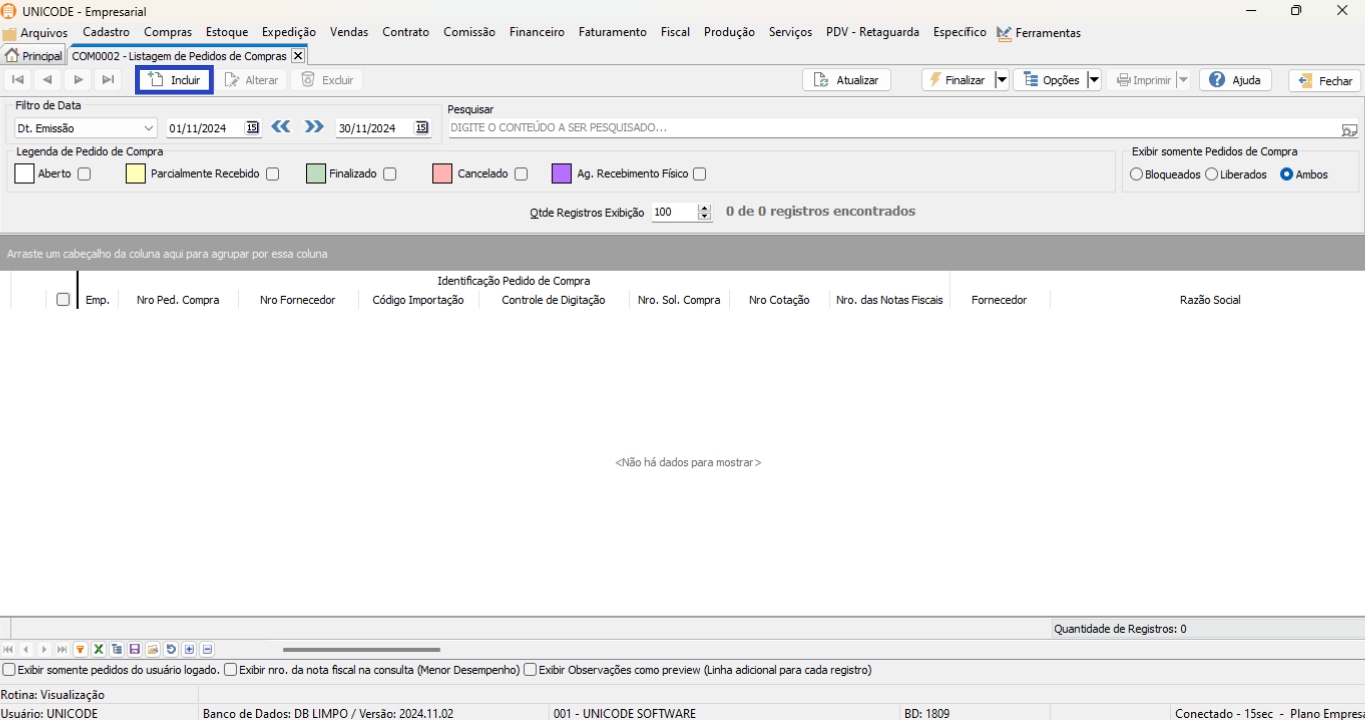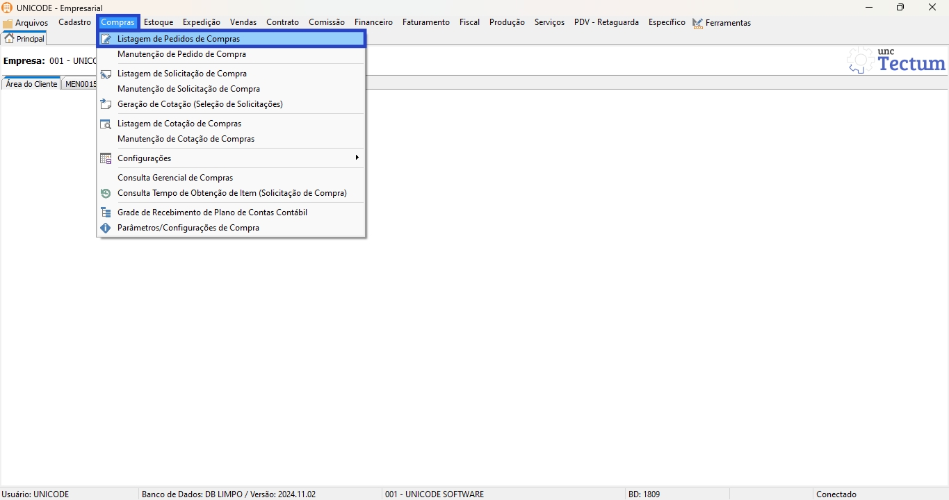 1. Clique em “Compras” e “Listagem de Pedido de Compra”;