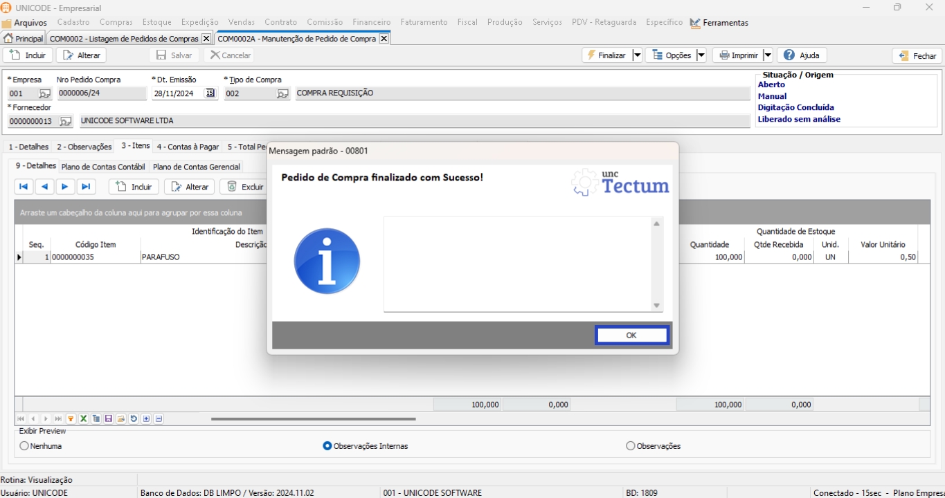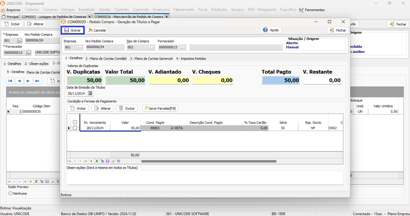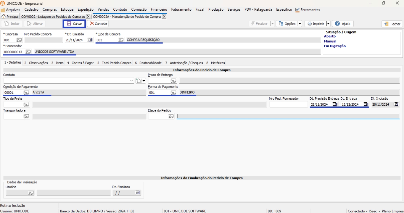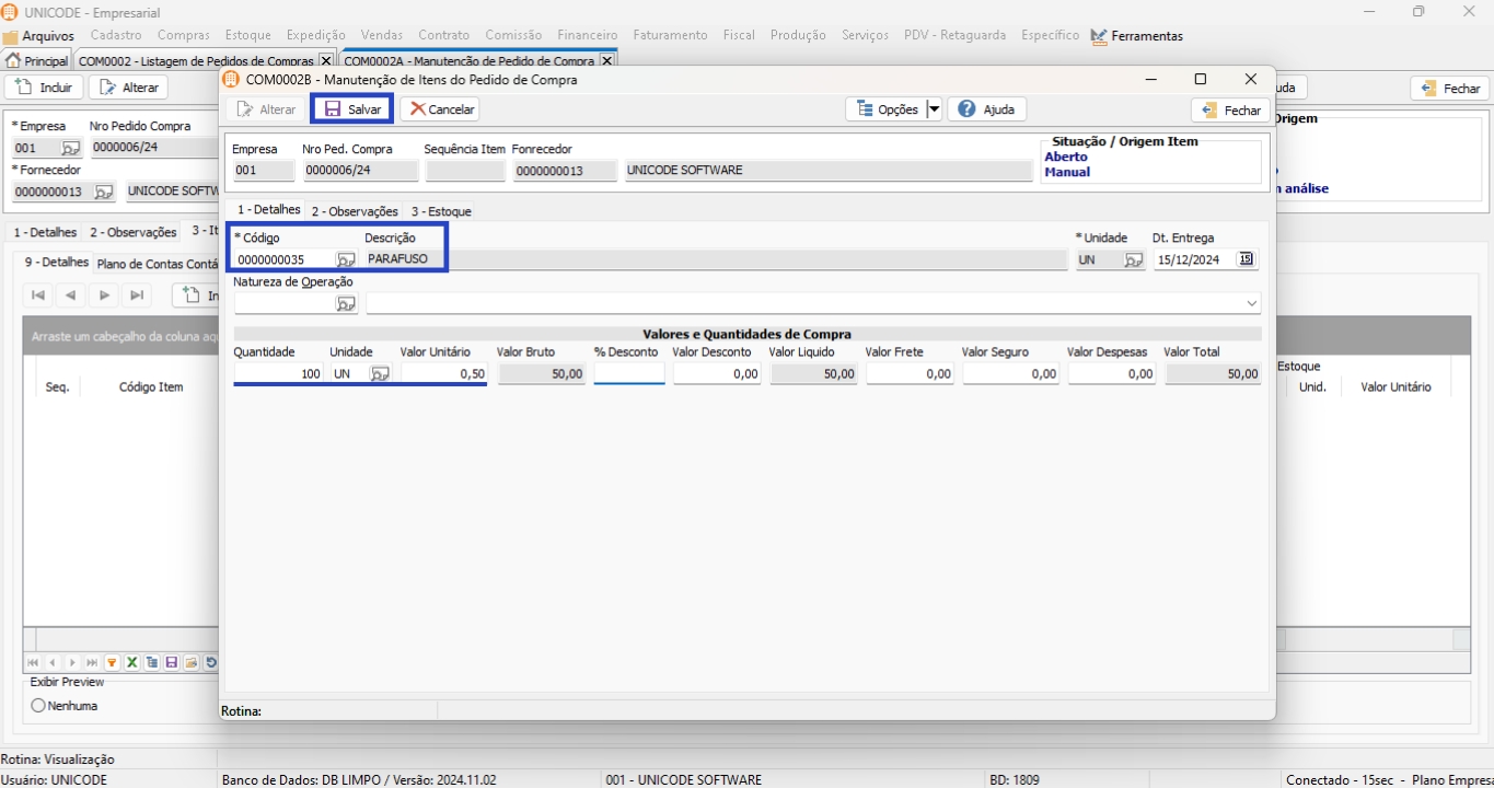 6. Selecione o item a ser comprado, e preencha as informações dele (quantidade, valor unitário, desconto, etc.). Com o item preenchido, clique em “Salvar”.