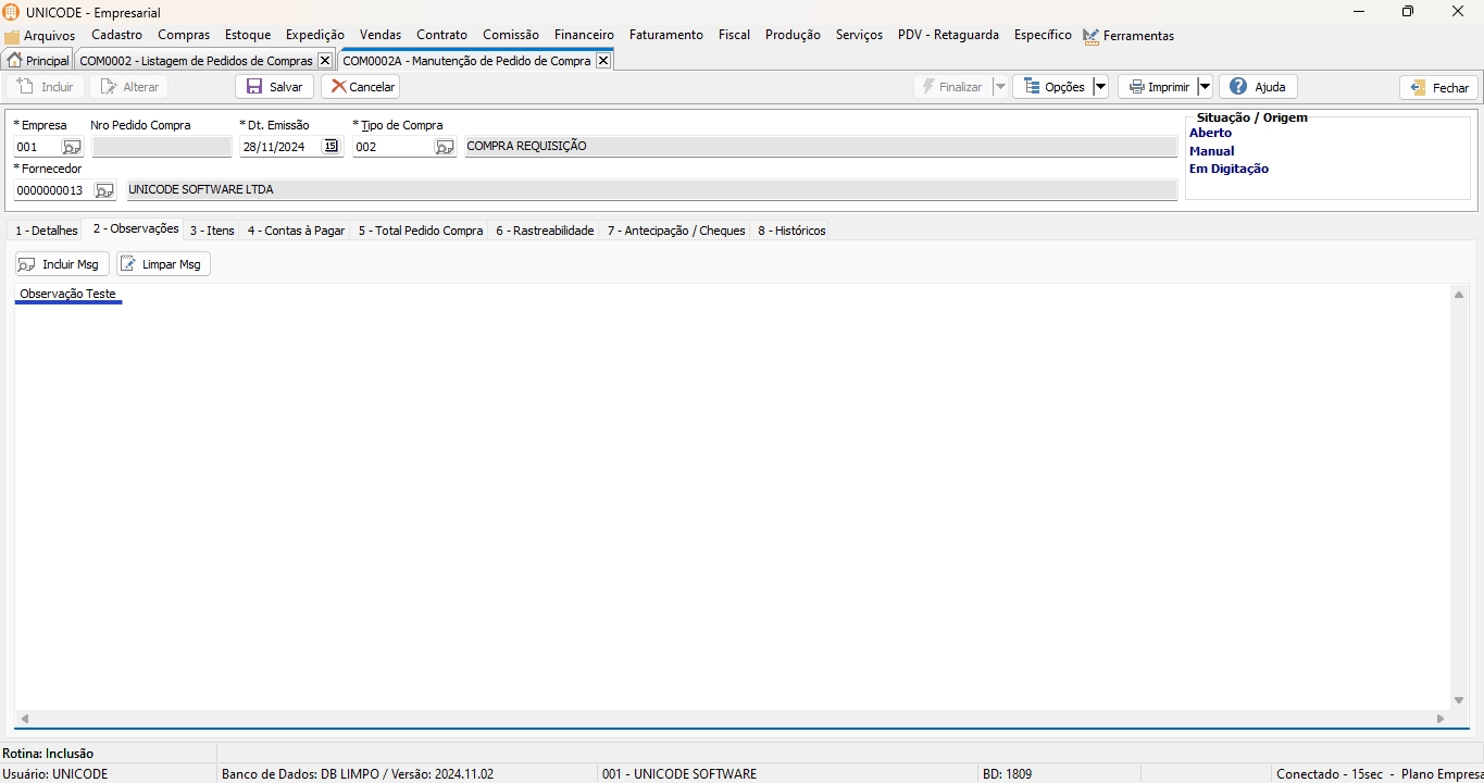 4. Na aba 2 – Observações, preencha as observações do pedido de compra caso necessário;