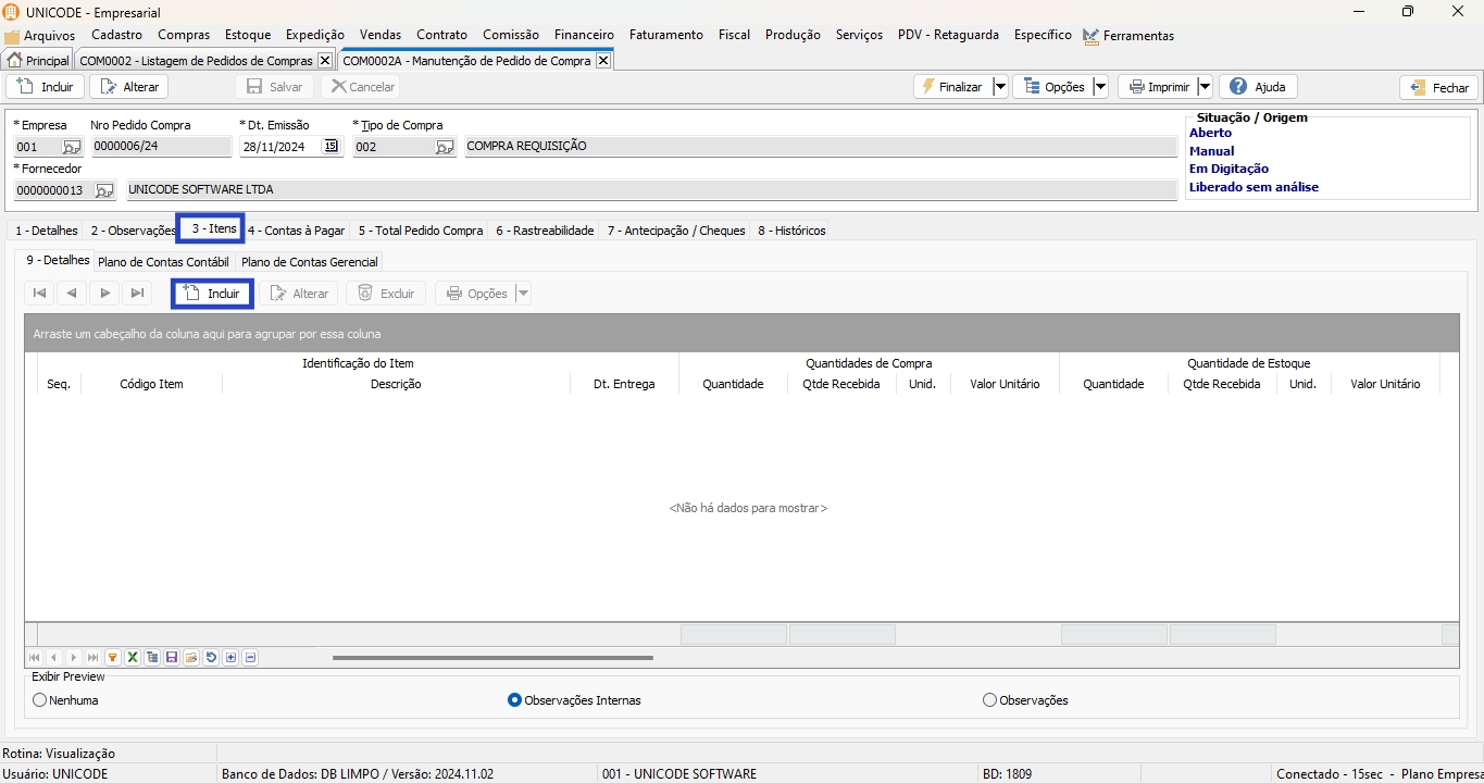 5. Na aba 3 – Itens, clique em “Incluir”;