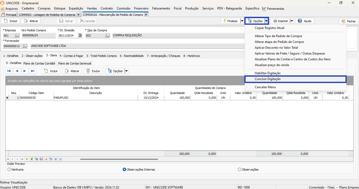 7. Quando finalizar a inclusão dos itens, clique em “Opções” e “Concluir Digitação”;