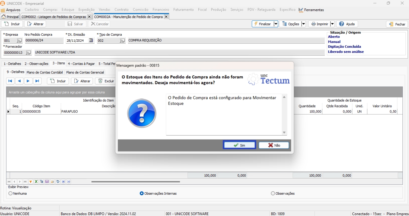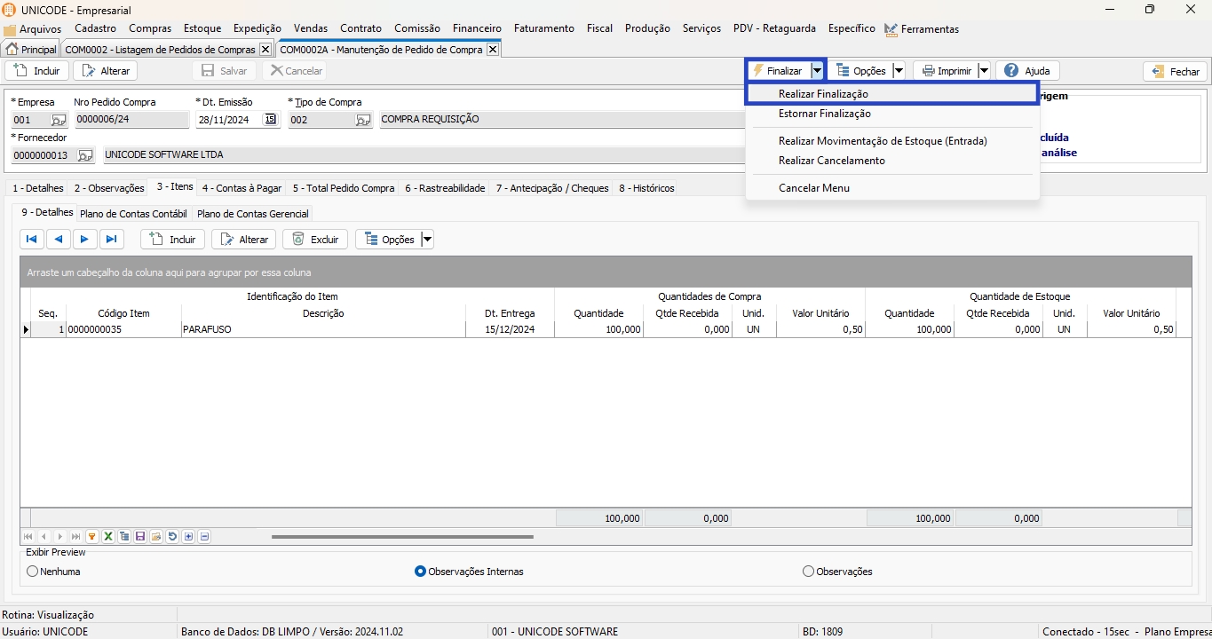 8. Assim que a mercadoria chegar, e for necessário realizar a movimentação de estoque e geração do financeiro (contas a pagar), clique em “Finalizar” e “Realizar Finalização”;