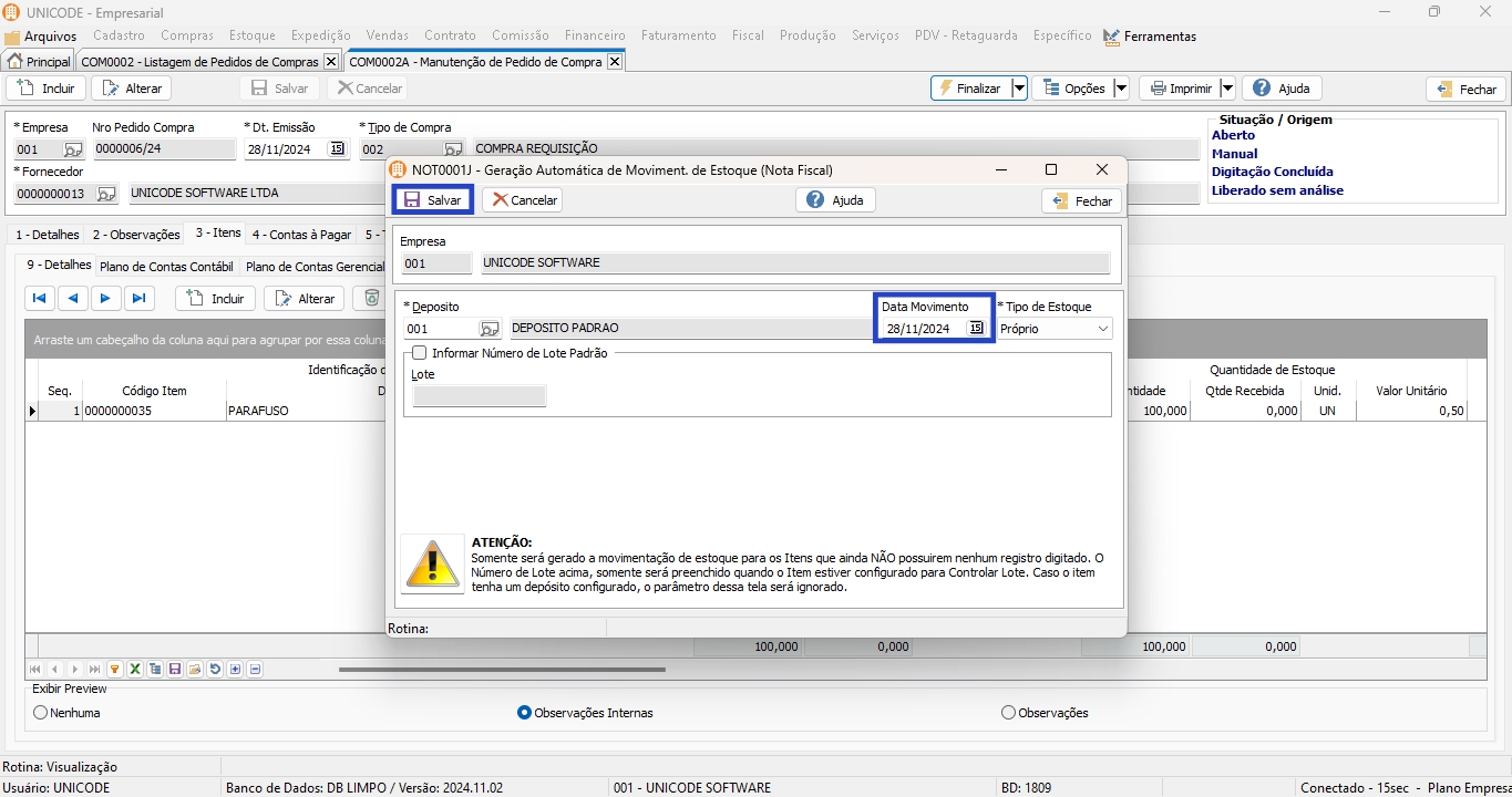 9. Permita a geração de estoque, confirme a data de movimentação do estoque e clique em “Salvar”;