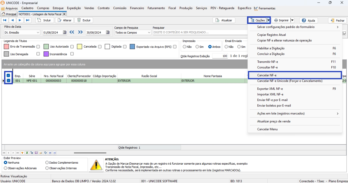 Com a nota selecionada, clique em “Opções” e em “Cancelar NF-e”;
