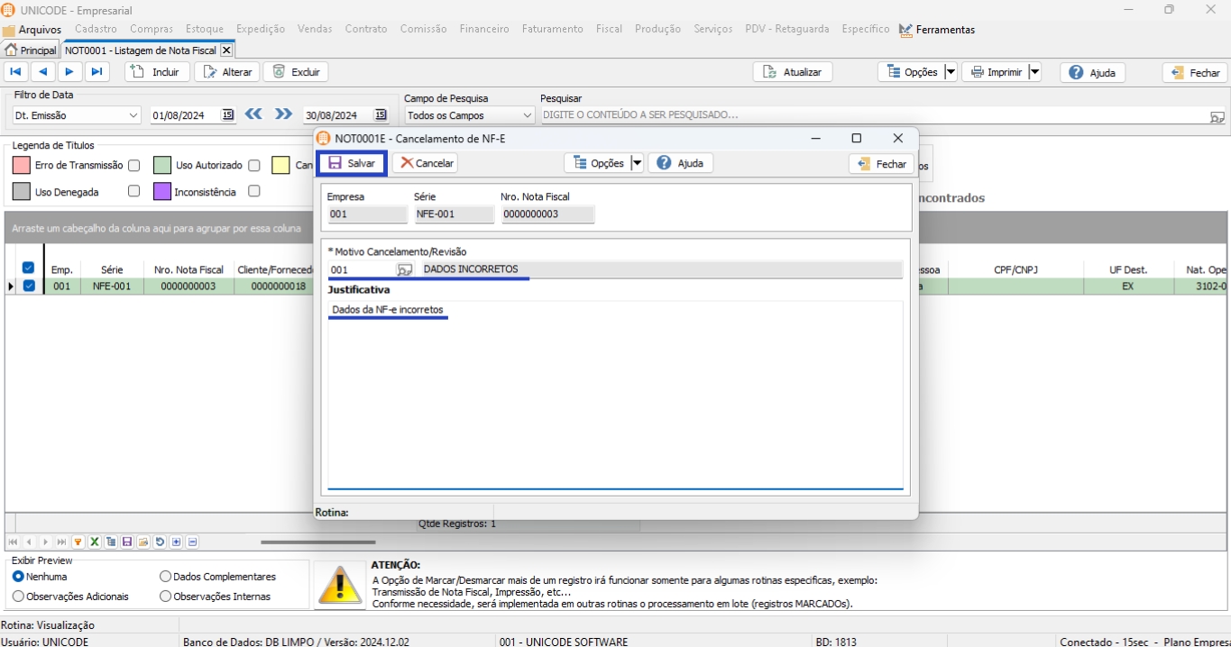 Após salvar, a nota fiscal será cancelada automáticamente.