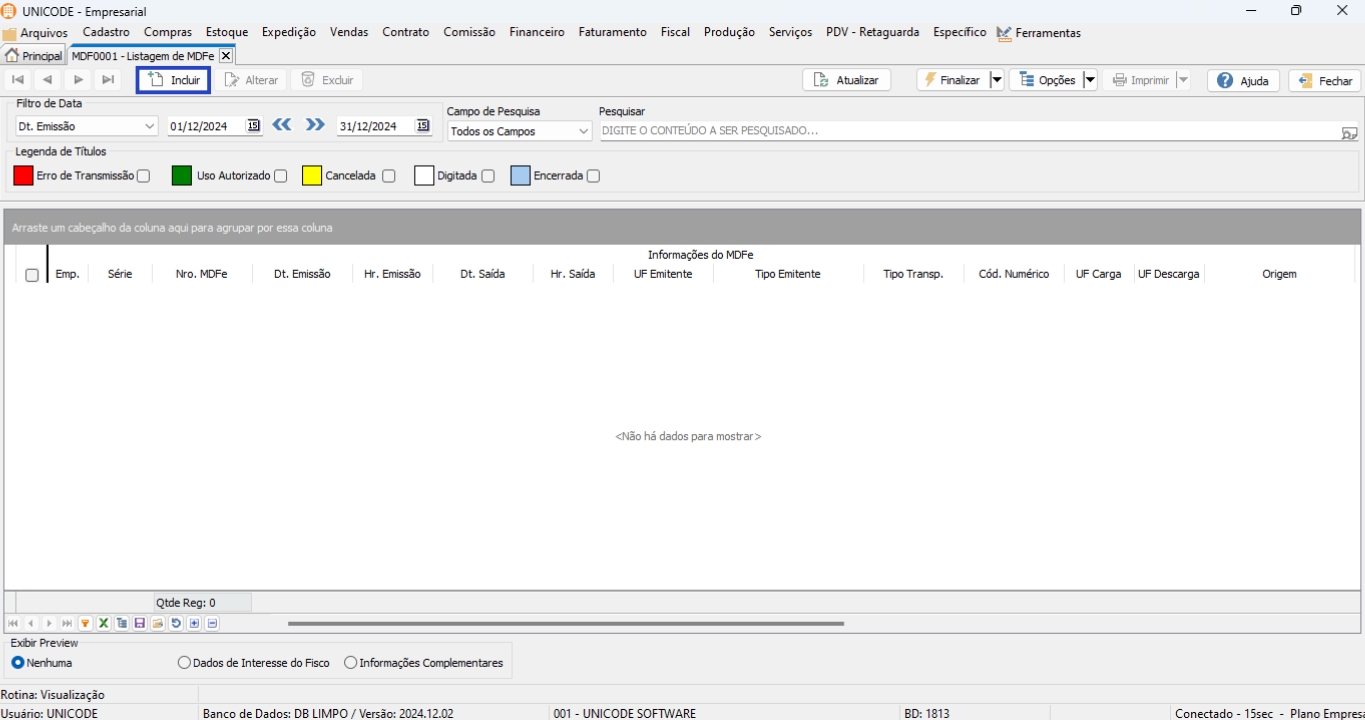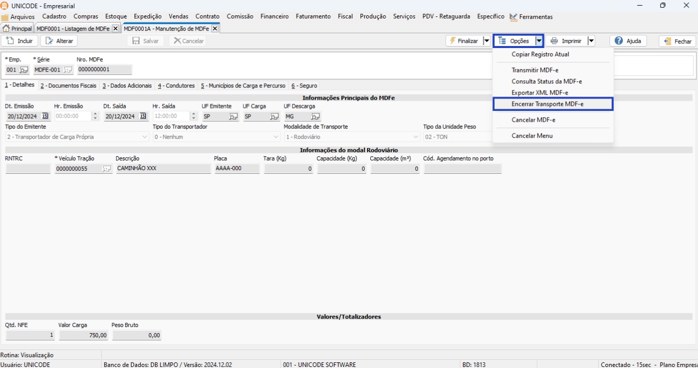 9. Para realizar o encerramento da MDF-e, clique em “Opções” e em “Encerrar Transporte MDF-e”;