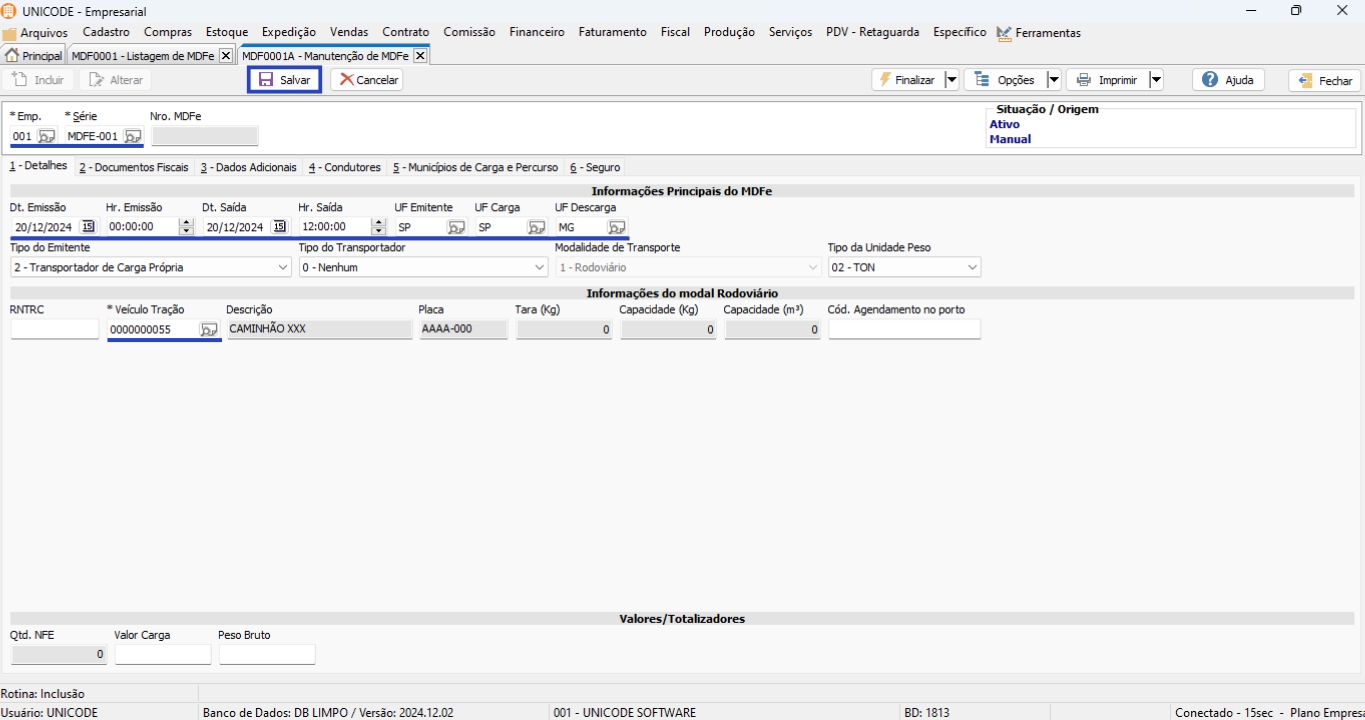 3. Na aba 1 – Detalhes preencha as informações referentes a MDF-e, como: Série, Data de Emissão/Saída, UF Emitente/Carga/Descarregamento, tipo do Emitente, e o veículo.