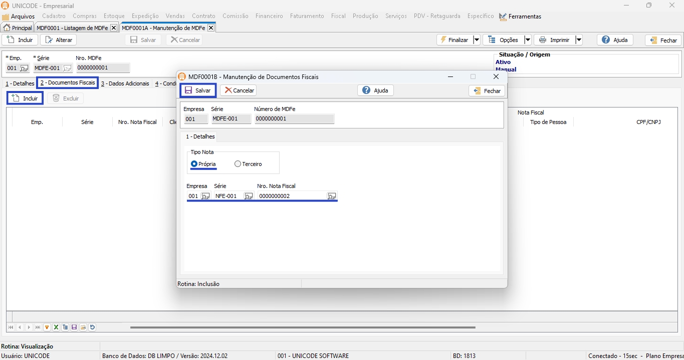 4. Na aba 2 – Documentos Fiscais, clique em “Incluir” e referencie a(as) nota(as) fiscal(ais) referentes a MDF-e e clique em “Salvar”;
