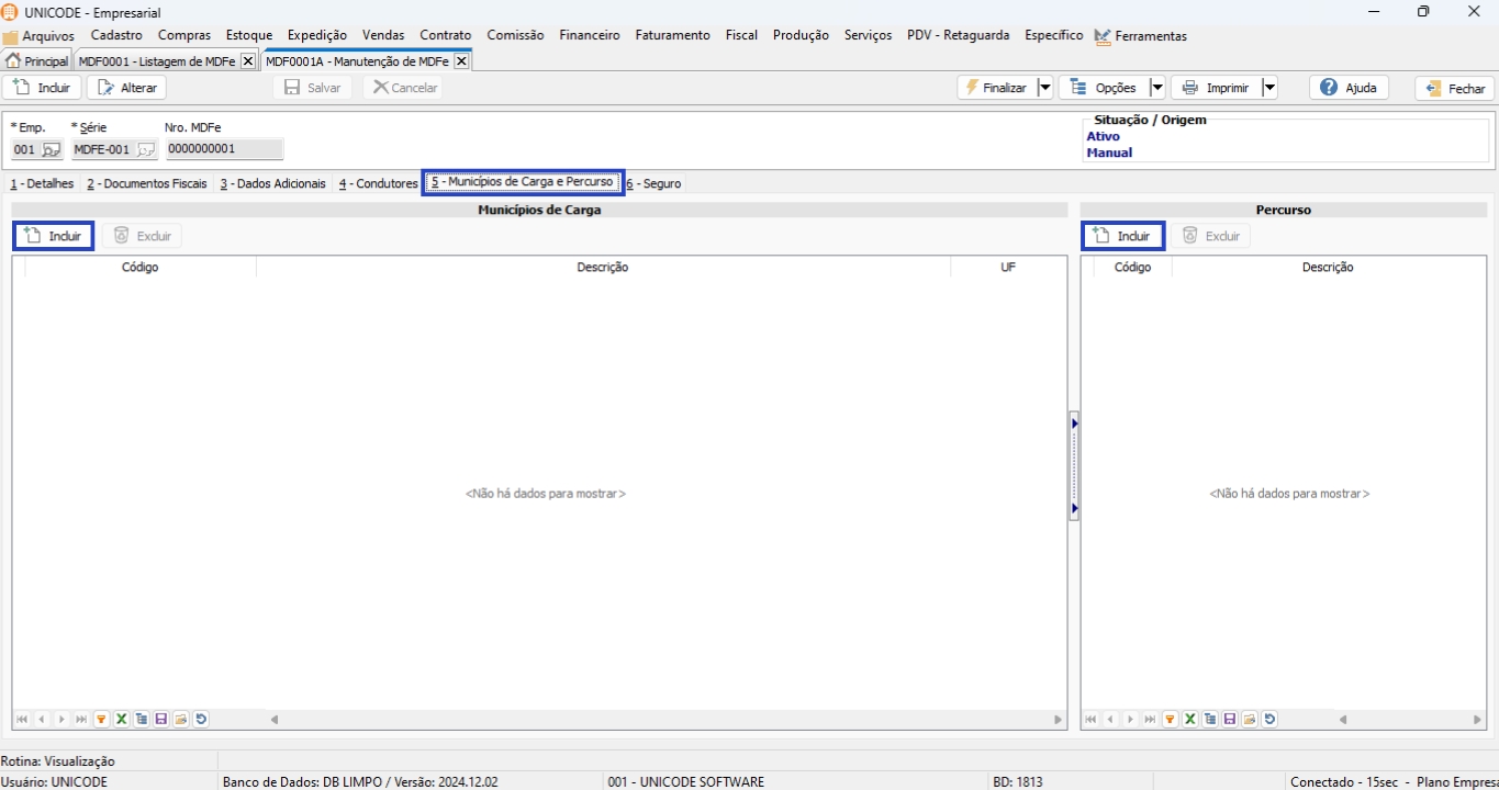 7. Na aba 5 – Municípios de Carga e Percurso, clique em “Incluir” para identificar os Municípios e Percurso (caso necessário);