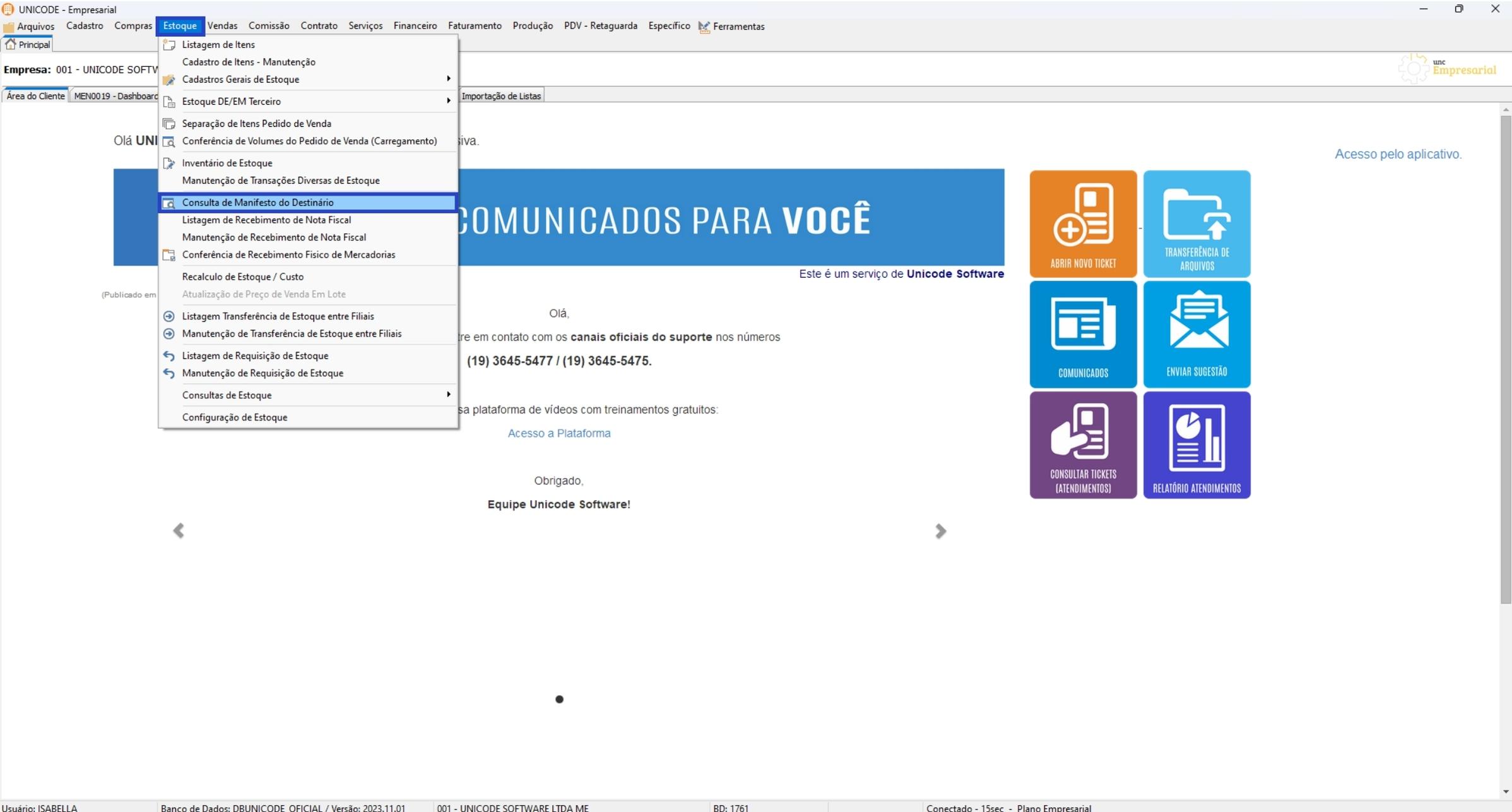 1. Clique em Estoque”, selecione a opção de Consulta de Manifesto de Destinatário”;