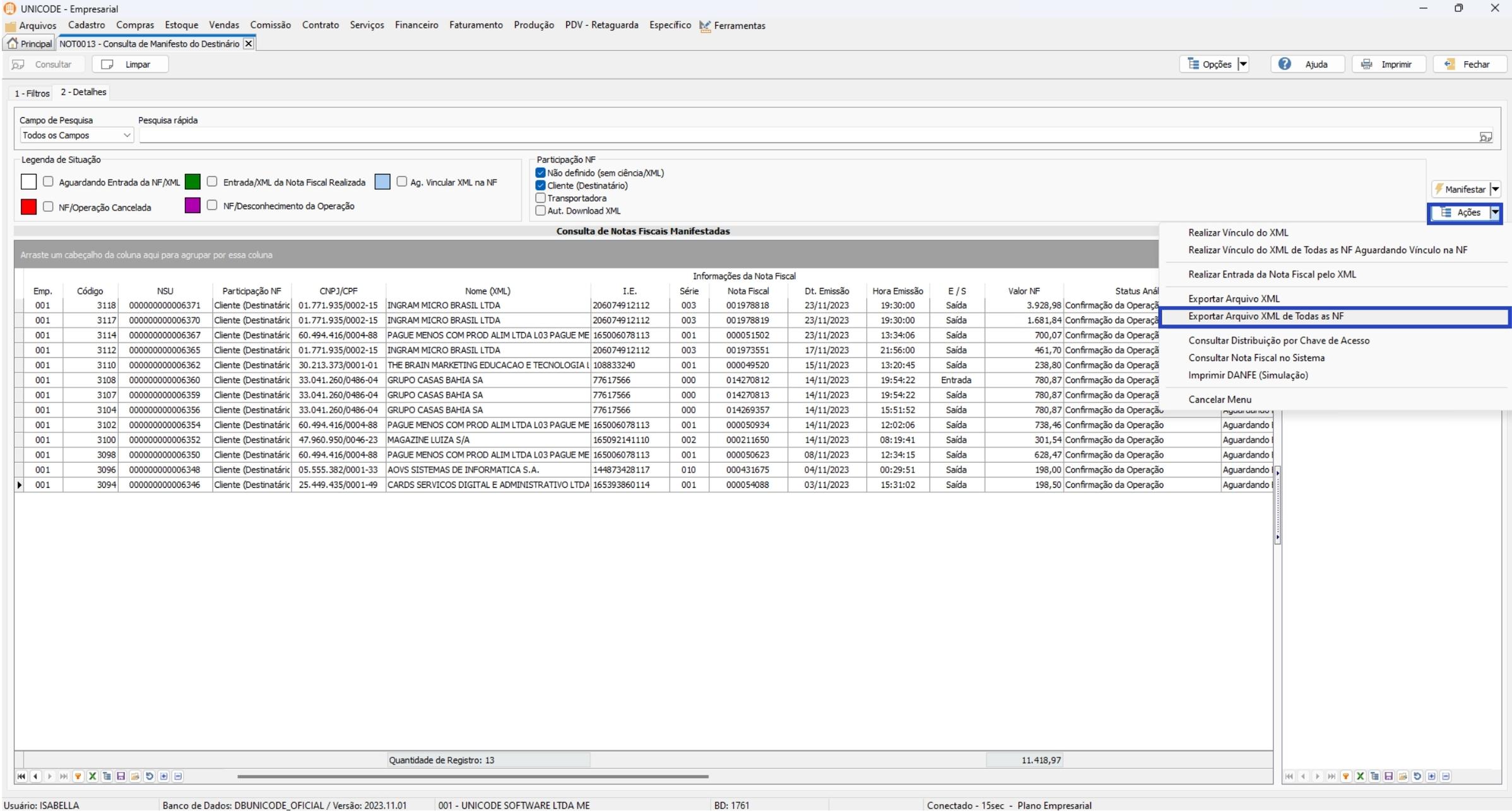 3. Clique em “Ações” e logo após em “Exportar Arquivo XML de Todas as NF”;