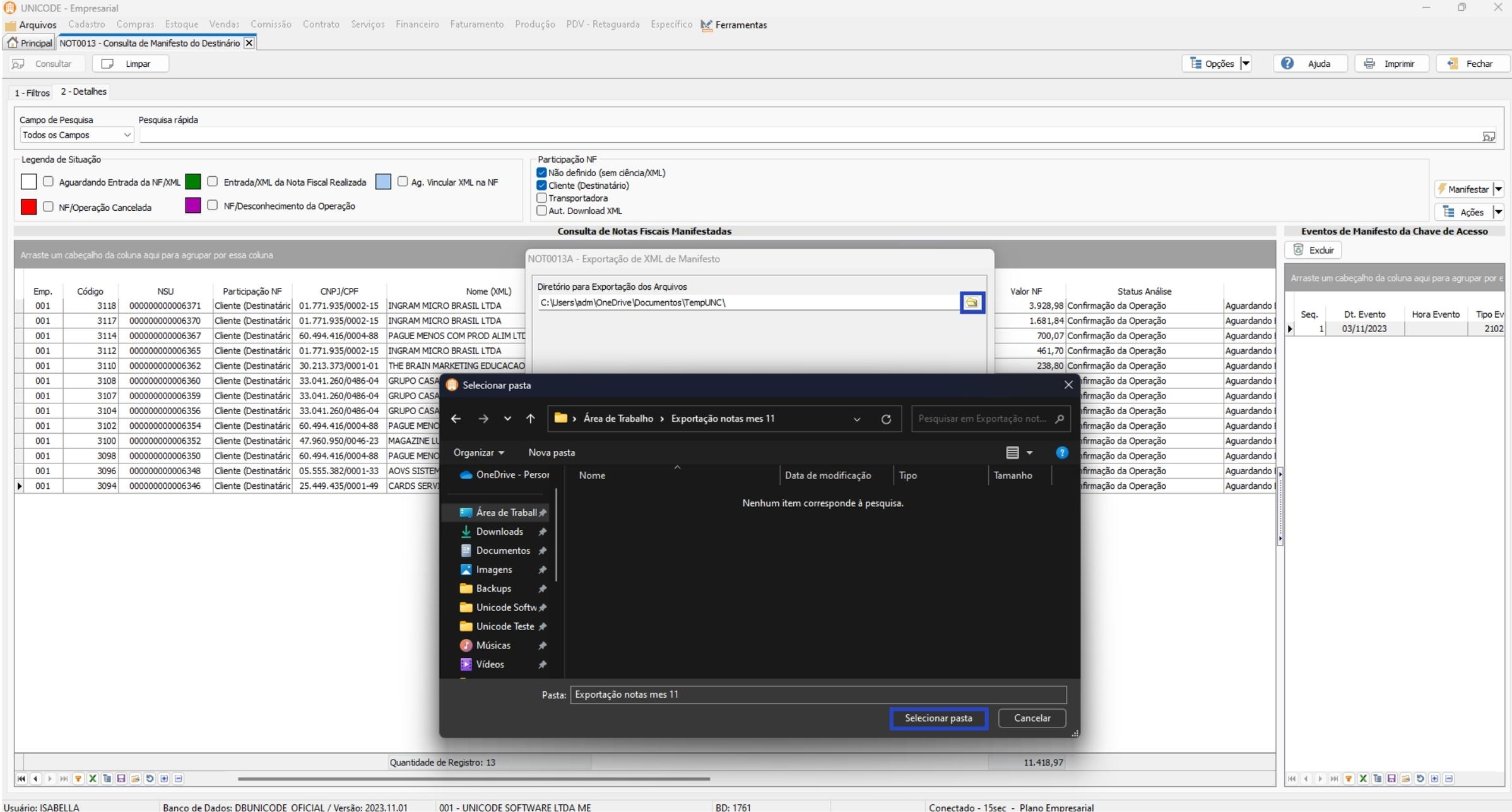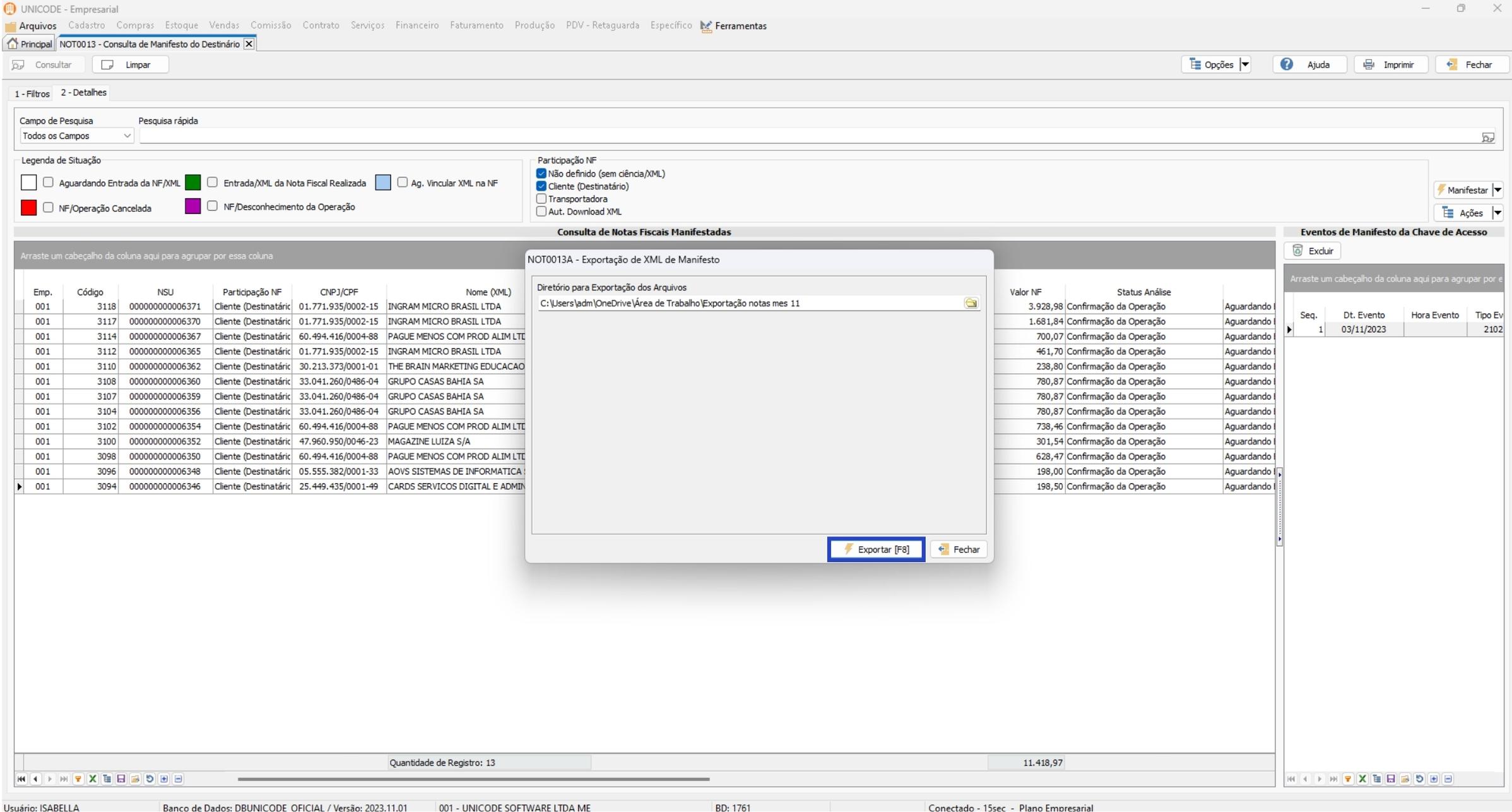 Para exportar todos os XMLs das notas fiscais de entrada: