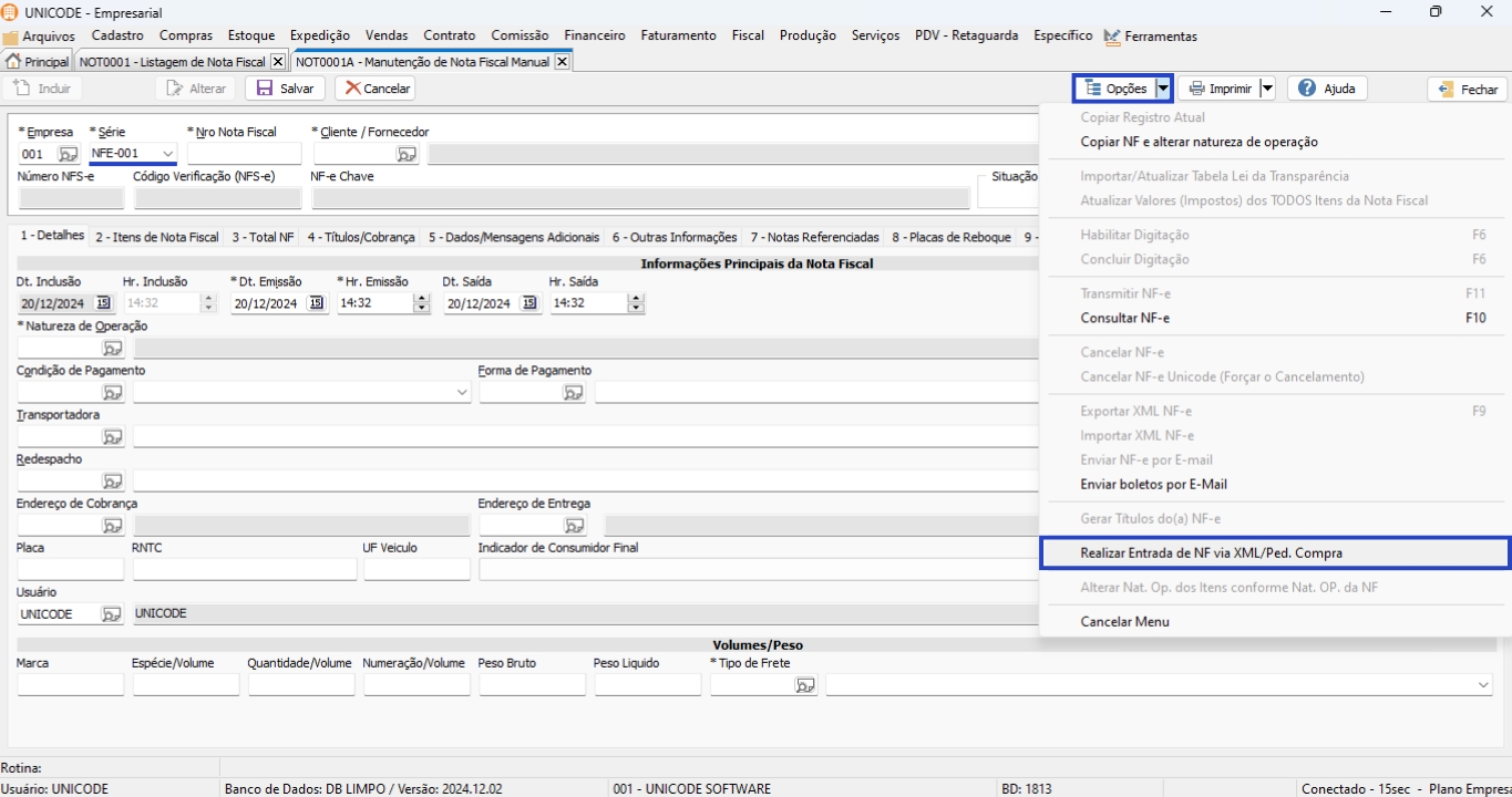 3. Selecione qual a empresa e série da nota fiscal. Logo após, clique em “Opções” e em “Realizar Entrada de NF via XML/Ped. Compra”;