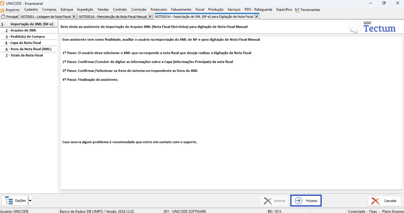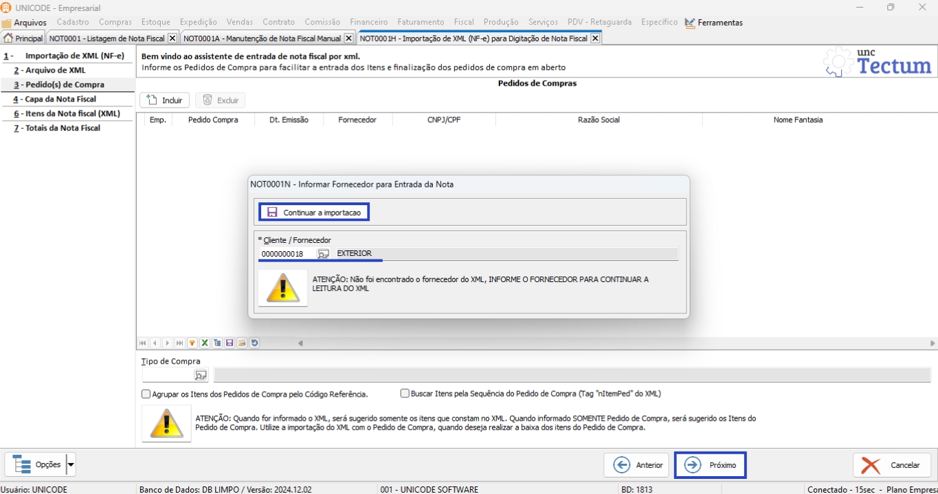 7. Selecione o Fornecedor da nota fiscal e clique em “Continuar a Importação” e clique em “Próximo”;