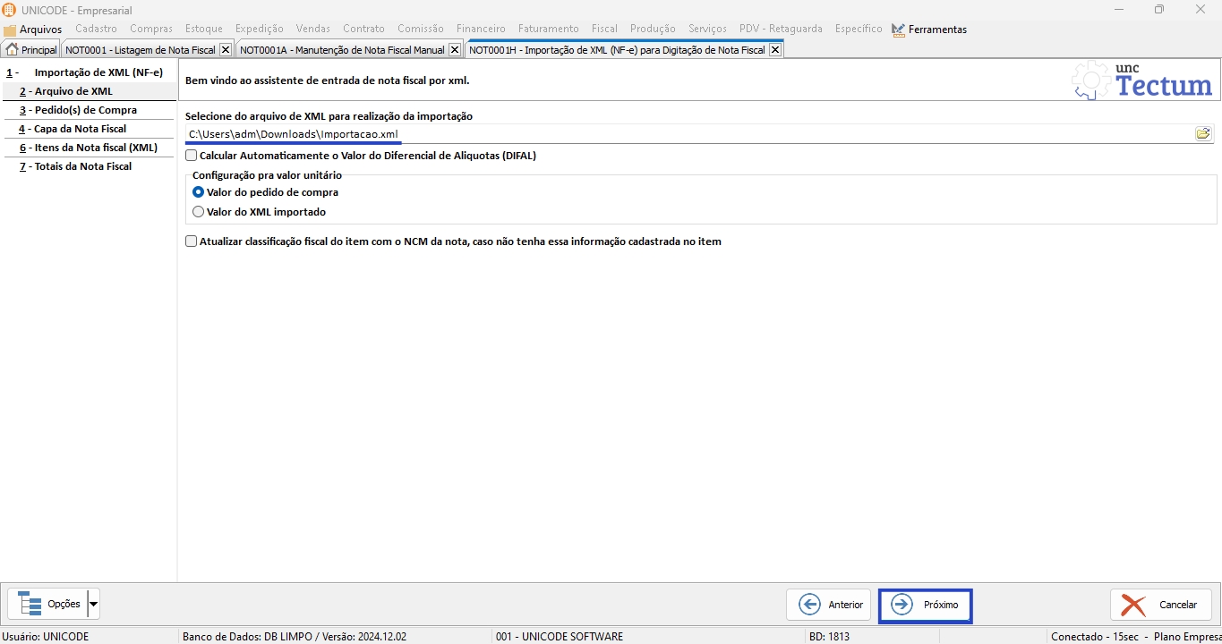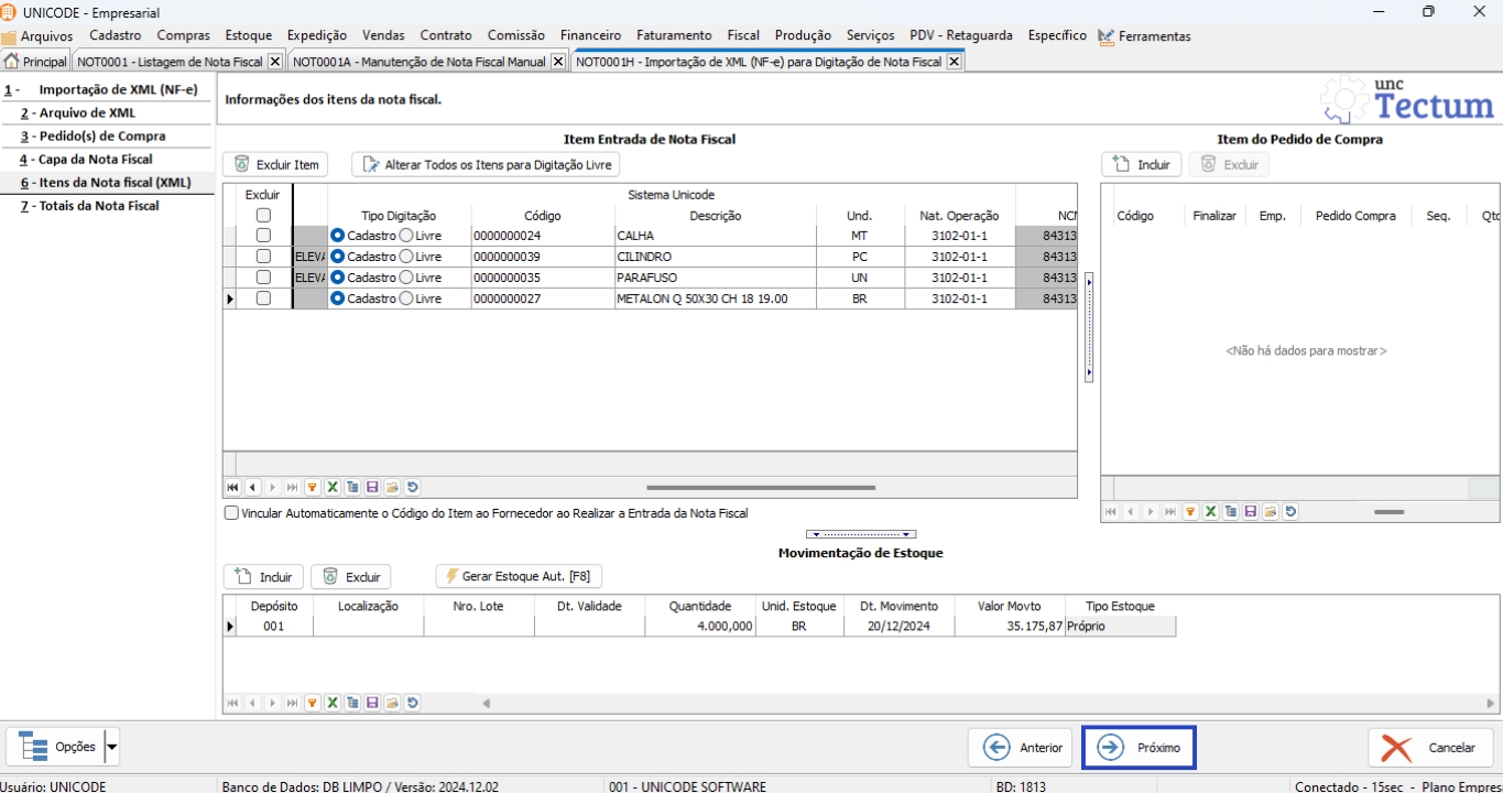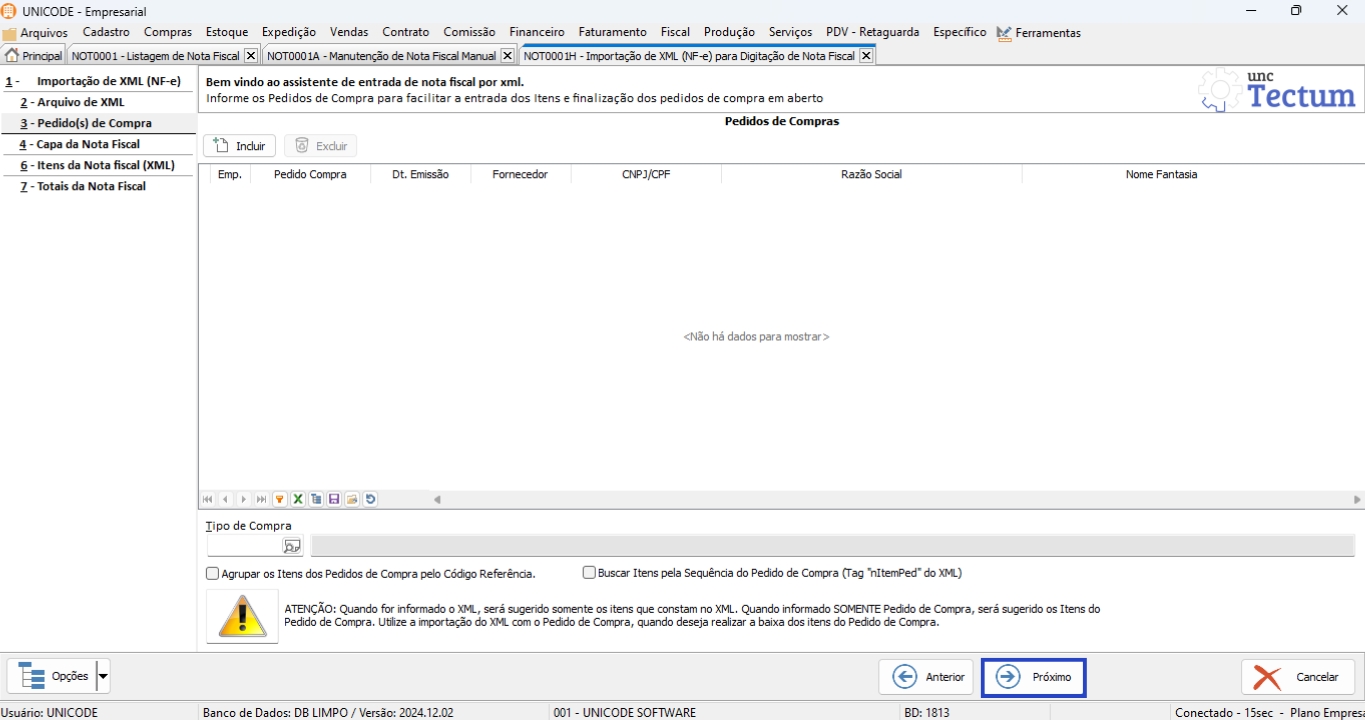 6. Na aba 3 – Pedido(s) de Compra, selecione o pedido de compra da importação, caso não possua, clique em “Próximo”;