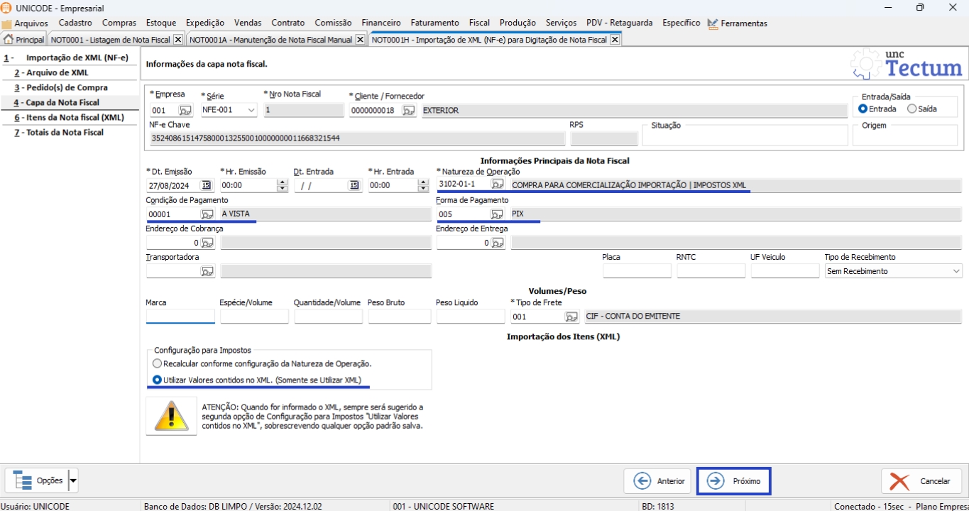 ** Dica: A natureza de operação deve conter a CFOP correta para a operação, porém não é preciso realizar a criação de naturezas de operações especificas para cada nota. Mantenha sempre selecionado a opção Utilizar Valores contidos no XML. para que os impostos sejam carregados de acordo com o XML.