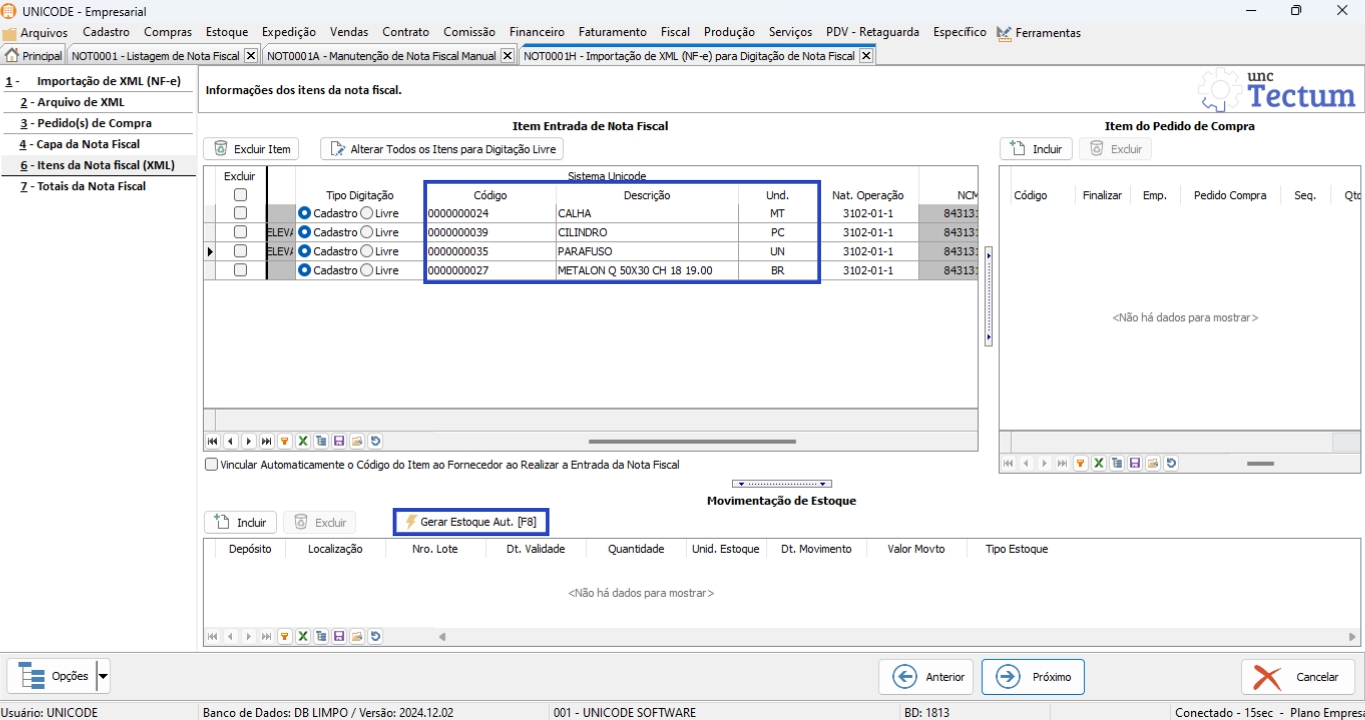 9. Localize os itens correspondentes a entrada, e clique em “Gerar Estoque Aut.”;