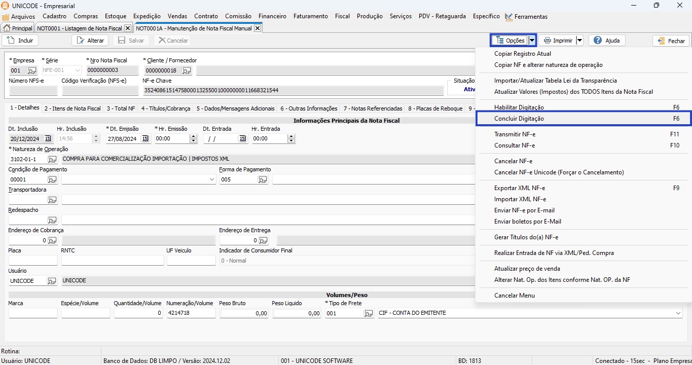 13. Para realizar a transmissão, clique em “Opções” e em “Concluir Digitação”;
