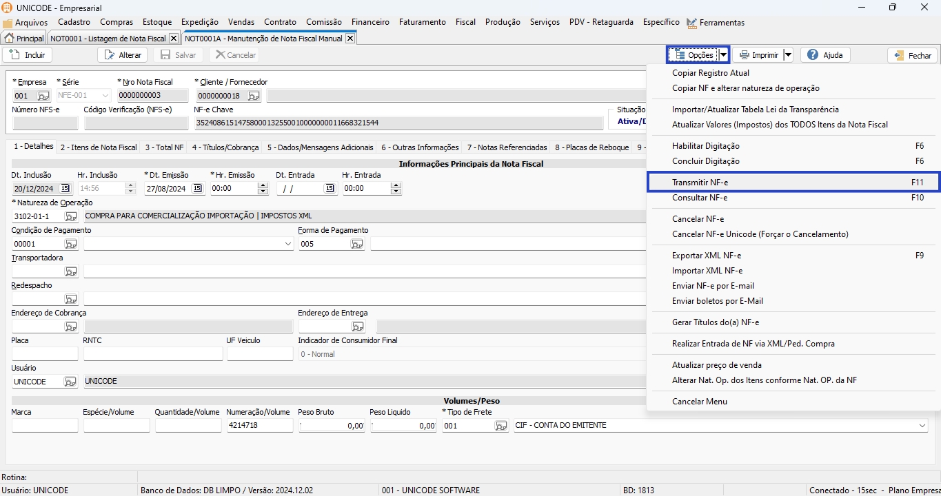 14. Com a digitação concluída, clique em “Opções” e em “Transmitir NF-e”;