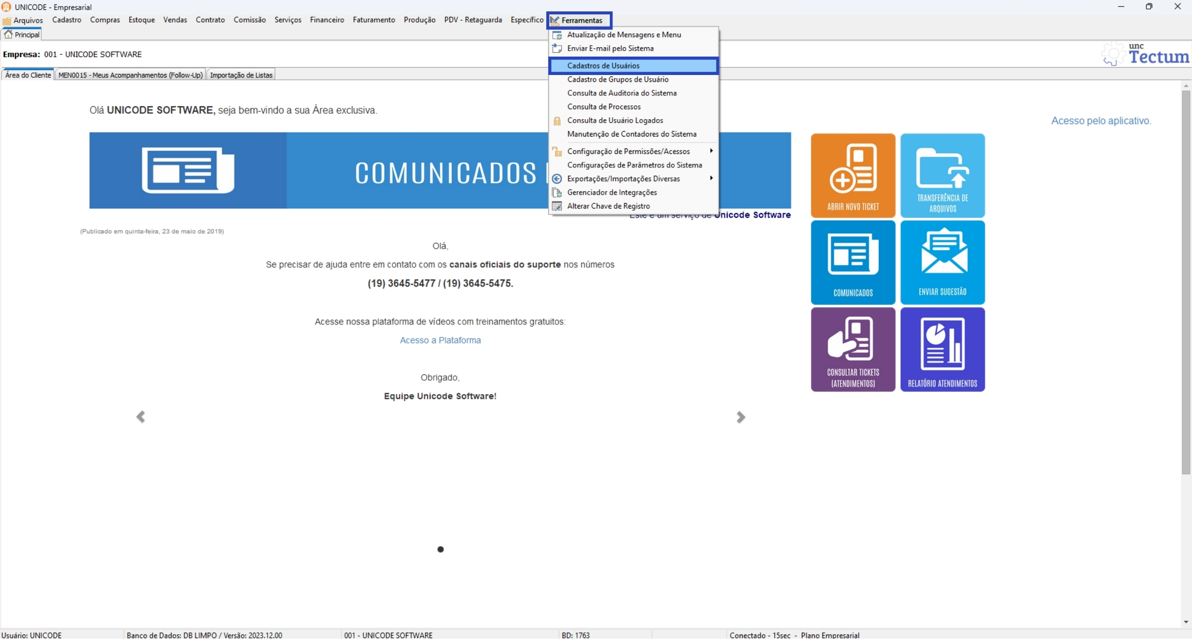 1. Clique em Ferramentas, selecione a opção de Cadastro de Usuário;