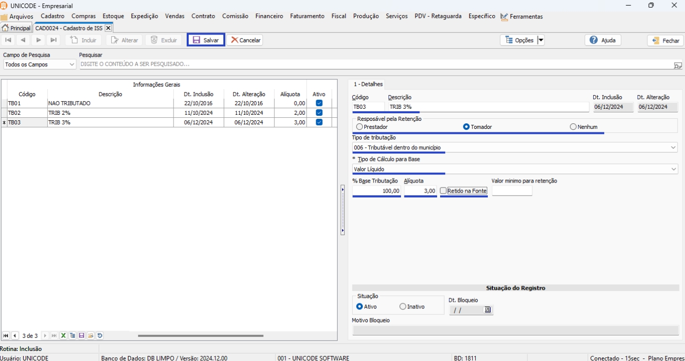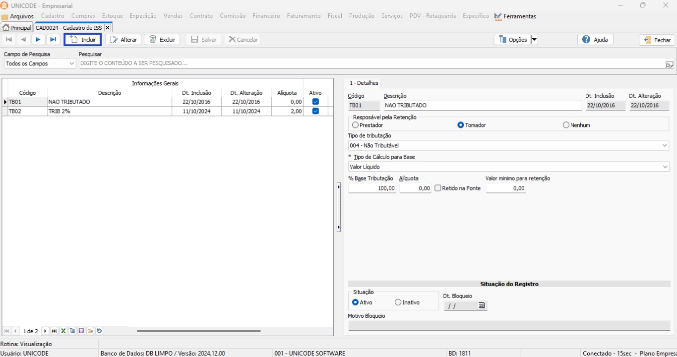 • Descrição: Descrição do cadastro a ser incluído (preencha com as informações principais do imposto, para ser fácil a localização do mesmo);