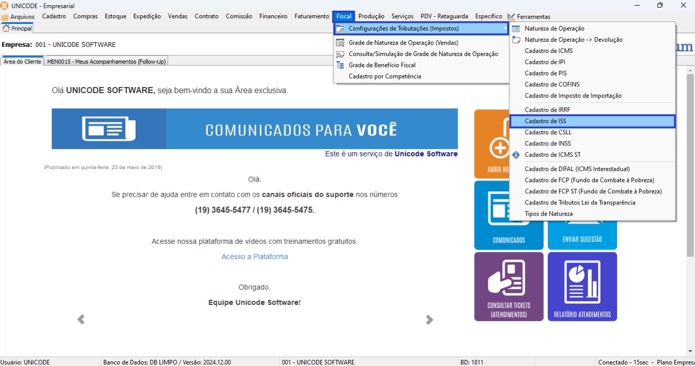 1. Clique em “Fiscal”, “Configuração de Tributações (Impostos)” e em “Cadastro de ISS”;