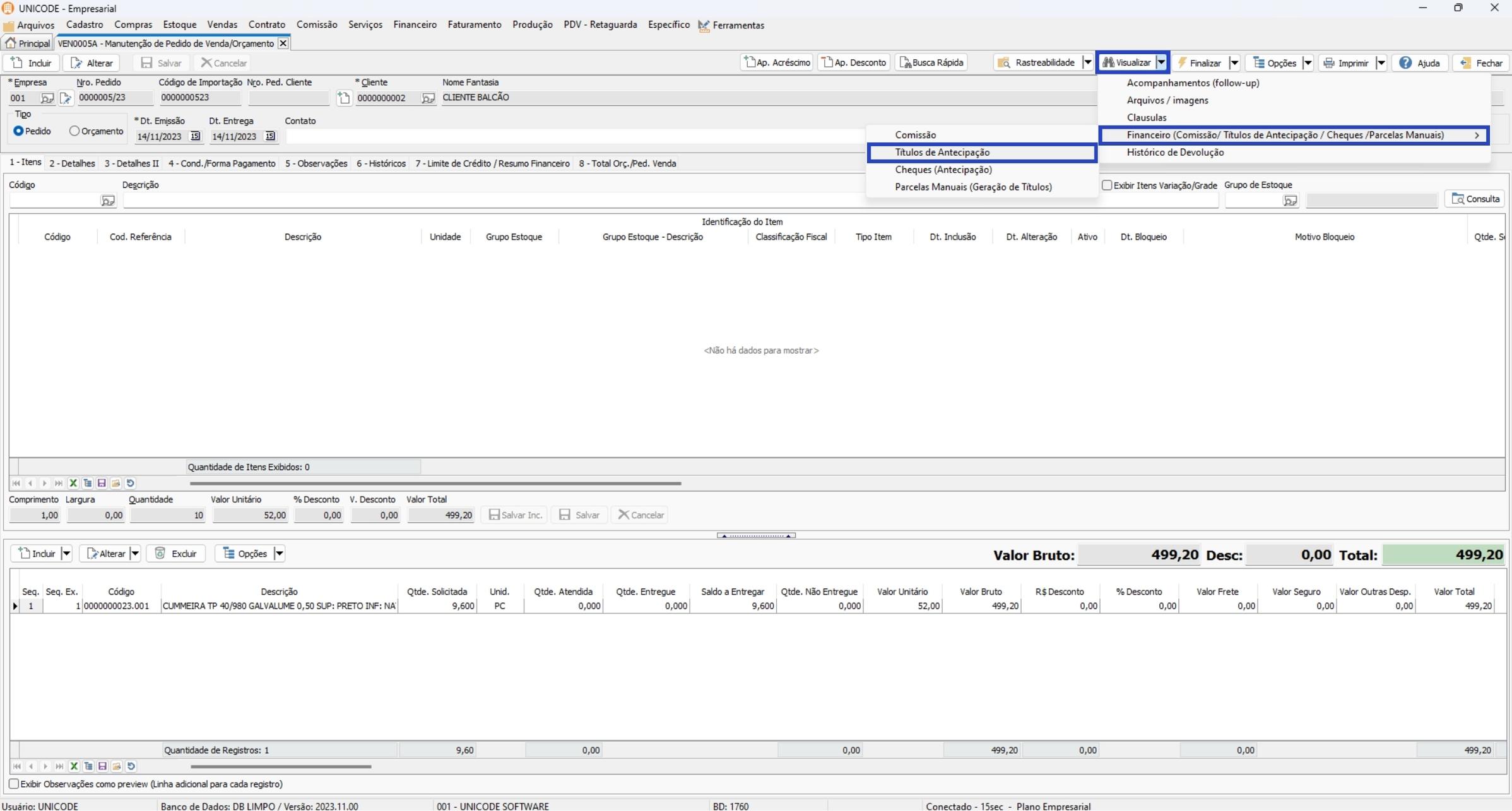 Clique no botão de Visualizar, e selecione a opção de Financeiro (Comissão/Títulos de Antecipação/Cheques/Parcelas Manuais). Selecione a opção de Títulos de Antecipação;